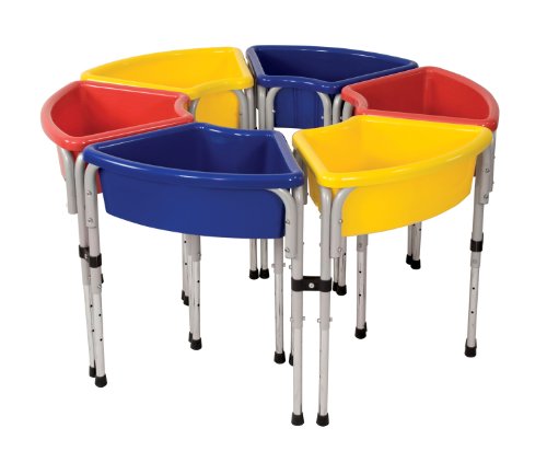 Sturdy Sand and Water Center where up to 6 children can play simultaneously!A 6-Station, modular Sand and Water Play Center that promotes tactile discovery, fine motor skills and social interaction. Each station features a removable basin for easy draining and cleaning, and translucent lids to keep the unit clean when not in use. Stations feature strong, steel legs that are adjustable to 20", 22.5" or 26" high, and can be connected into several configurations.Note: Colors may vary - may change without notice.* Accessories not included.* Never leave children unattended.* To avoid attraction by animals or insects, do not leave water standing after use.